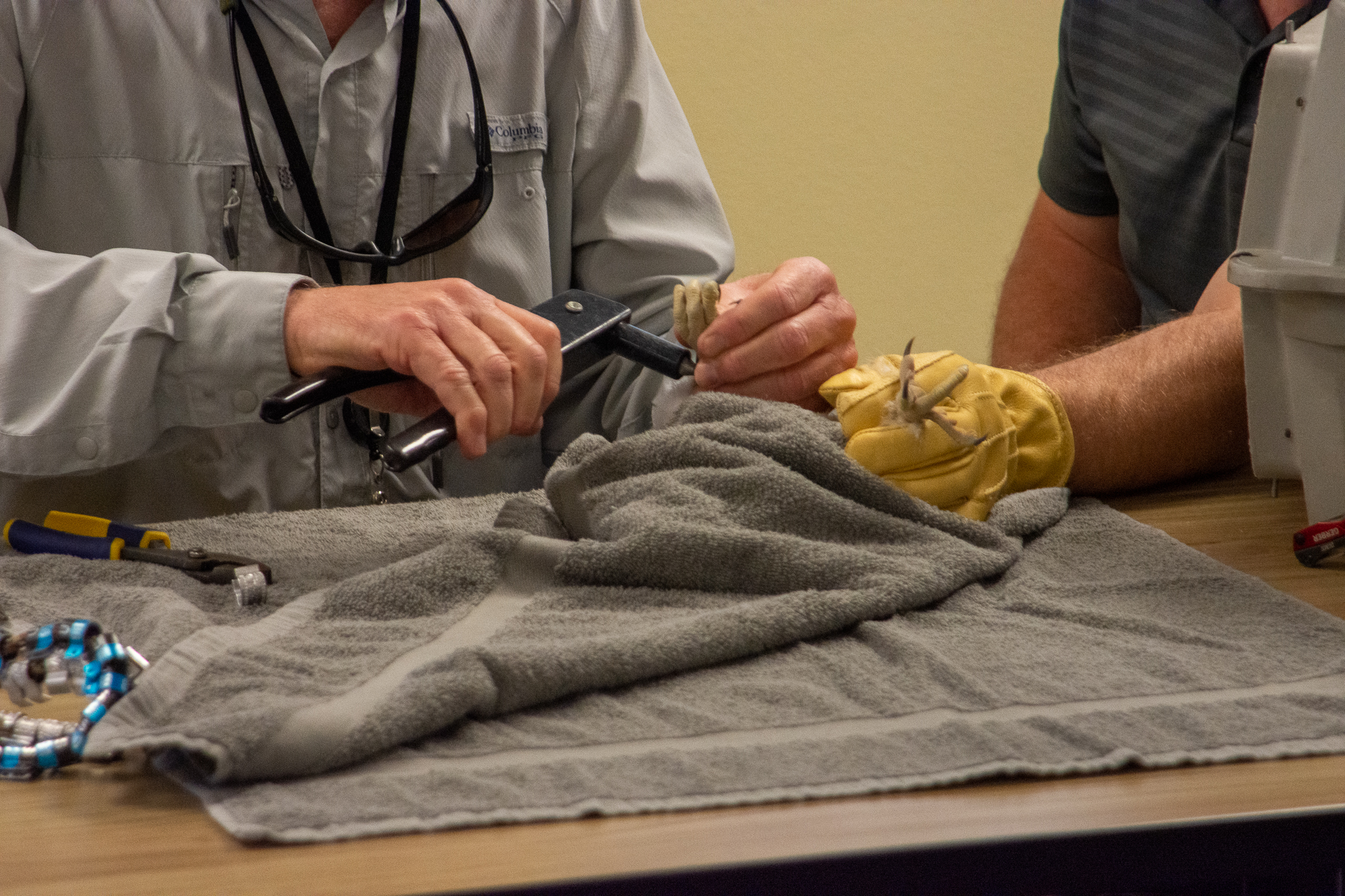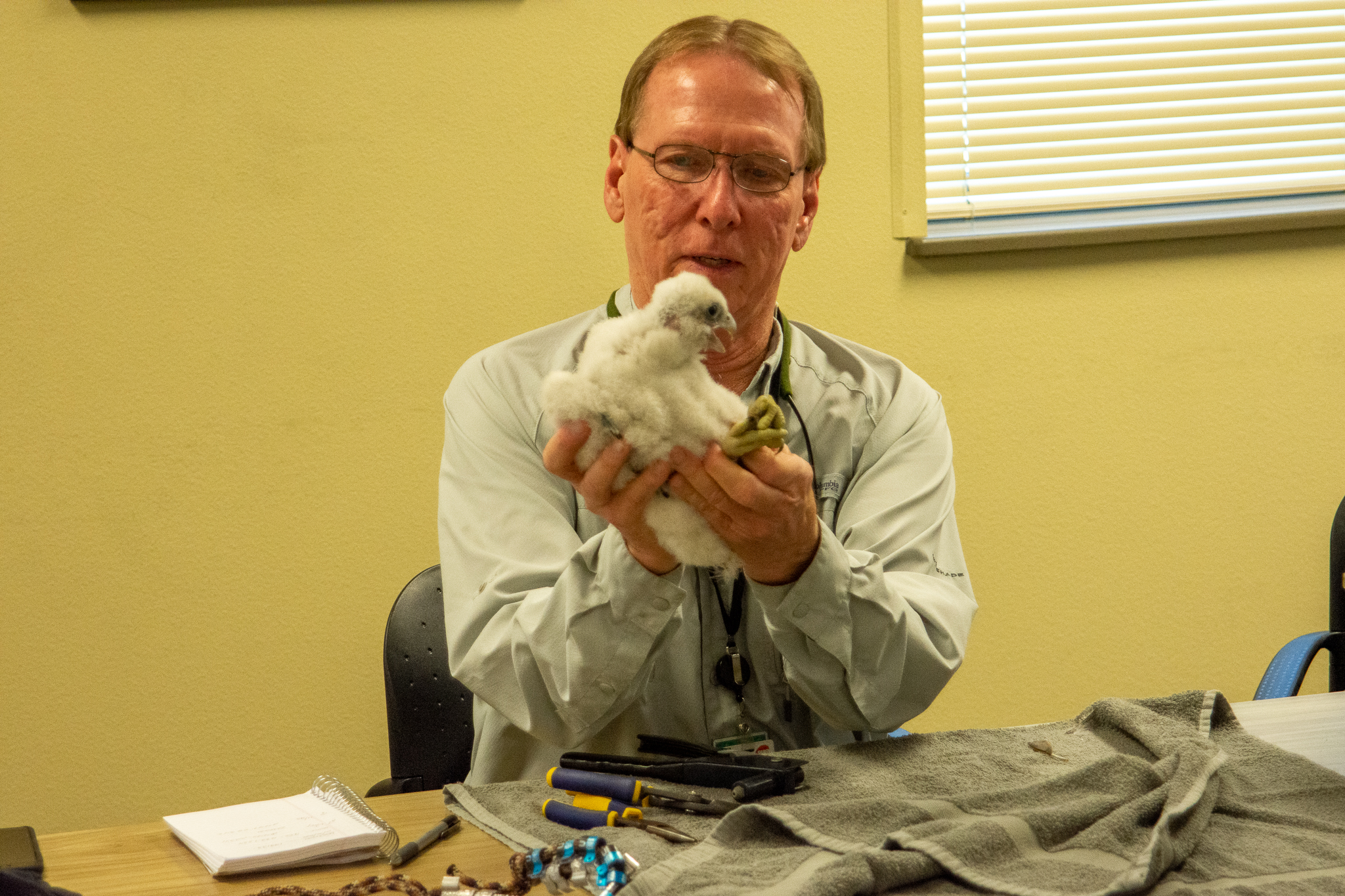 A crucial step in WPS and We Energies’ peregrine falcon recovery efforts is banding the chicks each year. The companies’ peregrine falcon manager places small metal bands on the chicks when they’re about three weeks old. The bands allow people to identify the falcon by the combination of colors, letters and numbers. Birdwatchers can then contact the falcon manager and let him know they’ve spotted one of the peregrines in the wild.